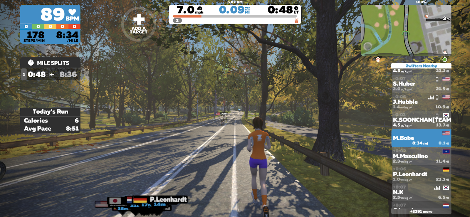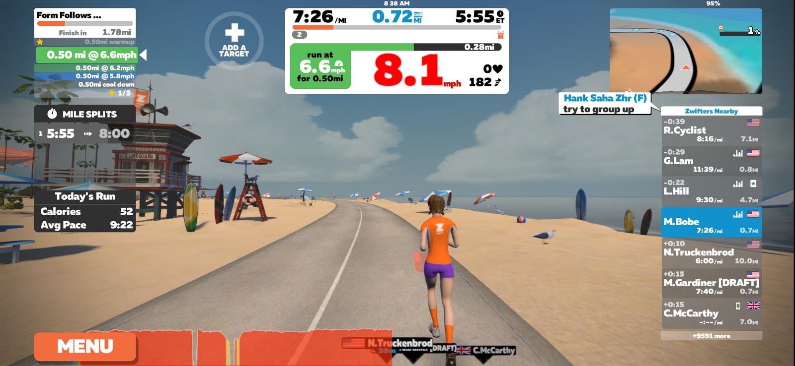 Zwift allows you to run solo but they also have options where you can run with the Zwift community. You can run with your real friends in the virtual world! They offer several events you can choose from. Three of the most popular are Monday Run Club, Workout Wednesday, and Saturday Run in the Park!
