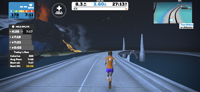On my second run I ran through Watopia....which is Zwift's fantasy island. There I got to run near a volcano and on the beach!