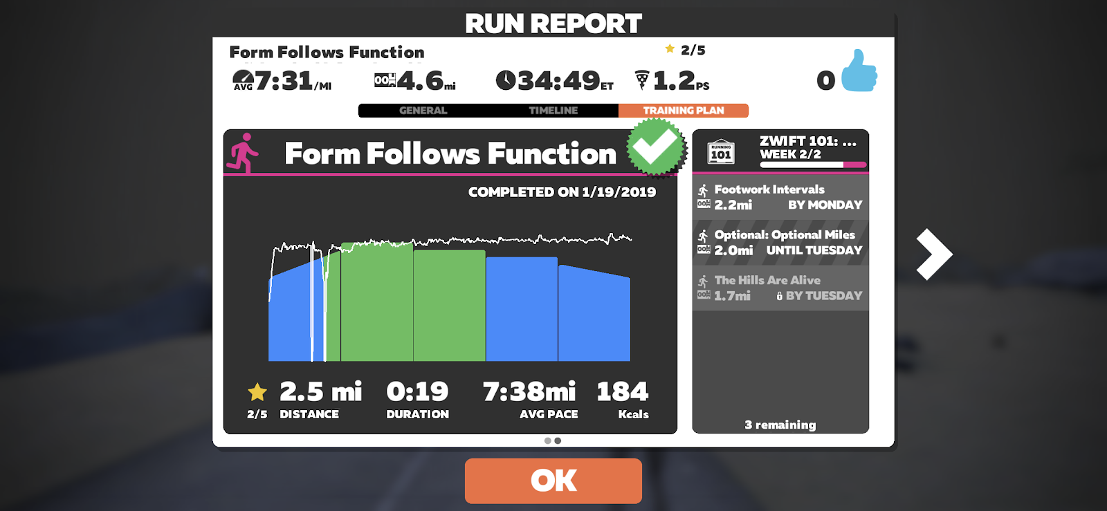 At the end of your run you get a run report that updates you on your training plan. It also congratulates you on your run and any achievements you've made!