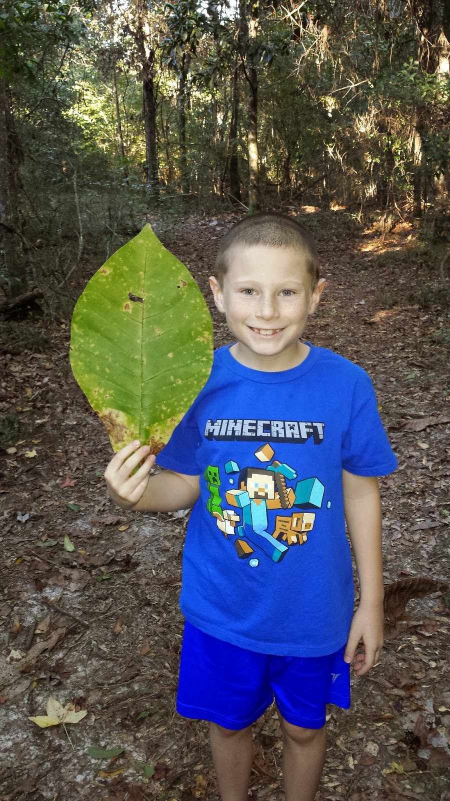 We found a tree in the woods with the biggest leaves I'd ever seen! Hayden picked one up and we were amazed at how huge it was!